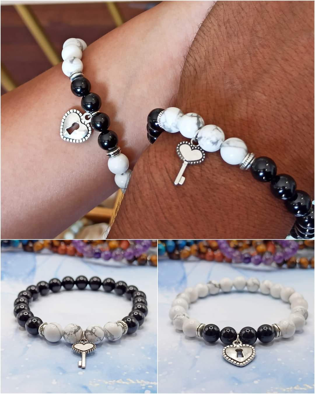 2 Bracelets/ couple « Cœur serrure&clé »: Howlite/pierre de soleil de Madagascar