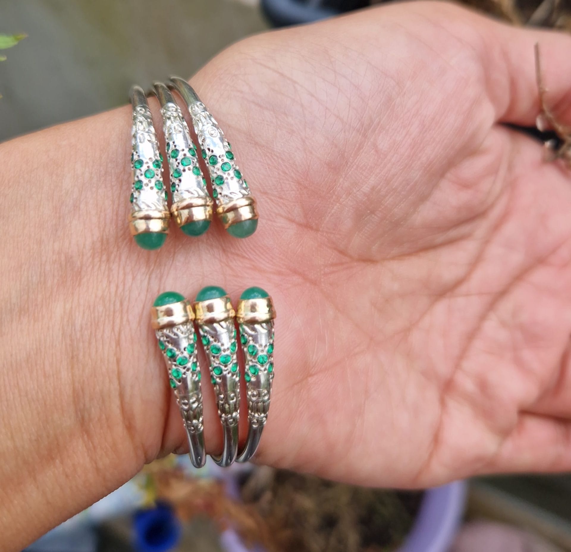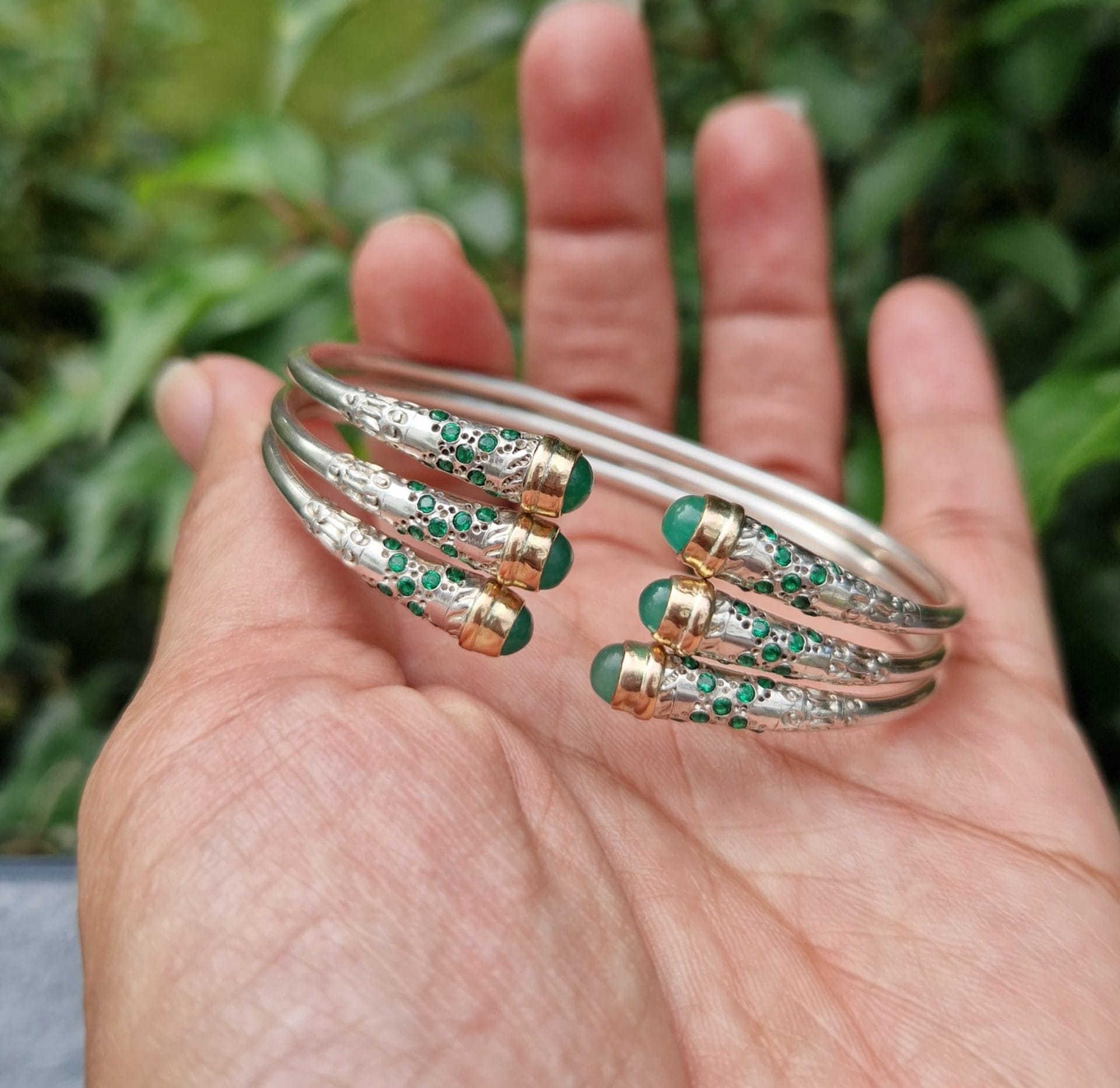 Bracelet triple vangovango saccalava en argent 925, avec 6 barres d’or 18k à cabouchon jade, il pèse environ 35g avec 4g d’or 18k on peut l’ajuster