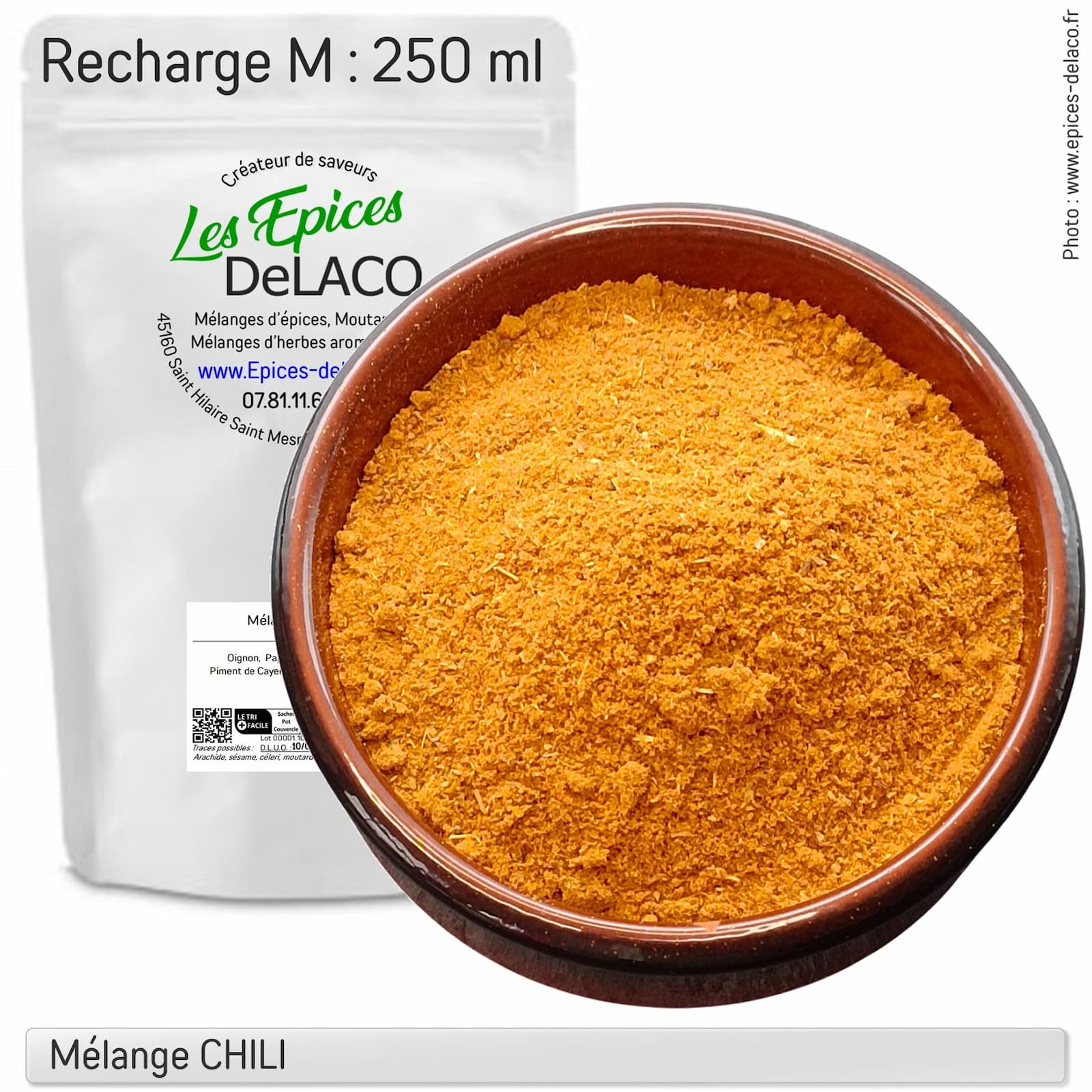 .Le mélange d’épices chili est utilisé pour donner de la saveur et de la chaleur aux plats de chili, de ragoûts, de soupes, mais aussi pour parfumer les poêlées de légumes. Mais il peut aussi être saupoudrer sur les grillades avant ou pendant la cuisson au barbecue, ou plancha.