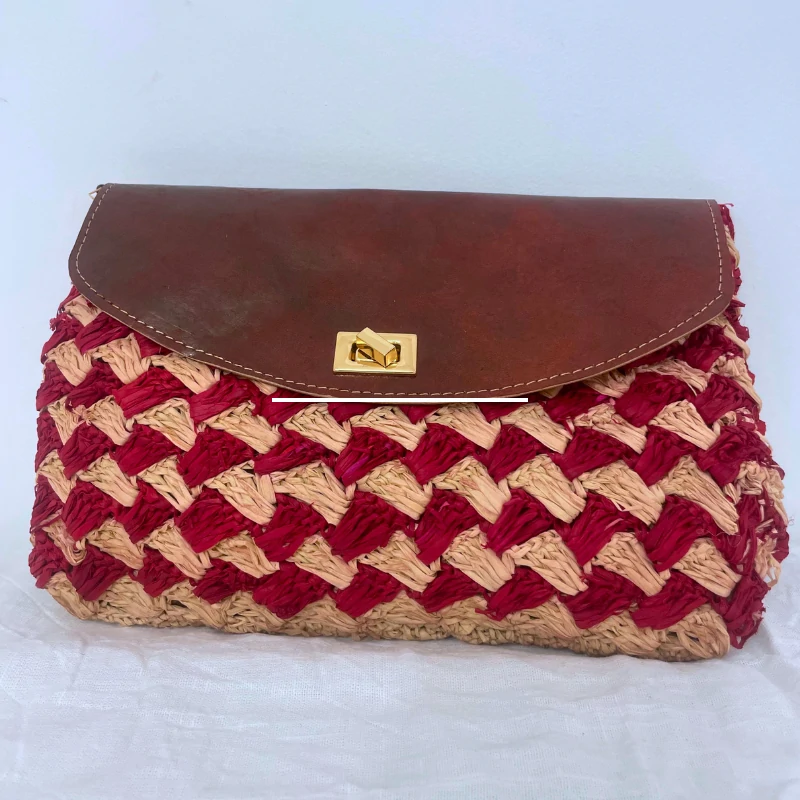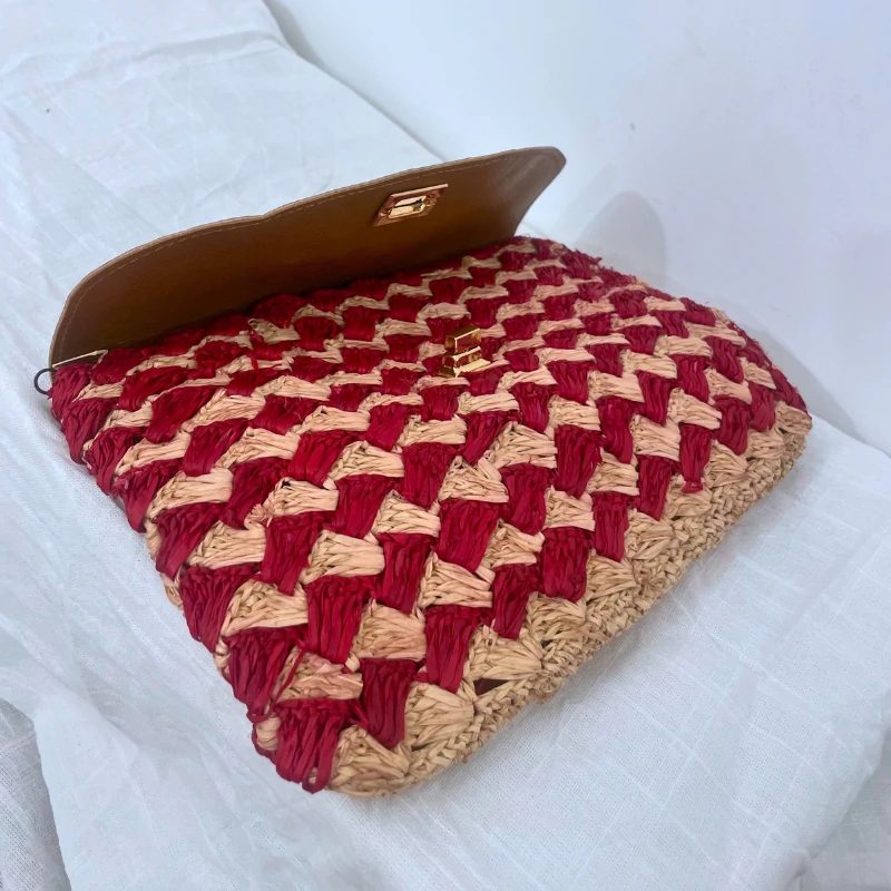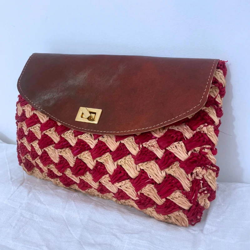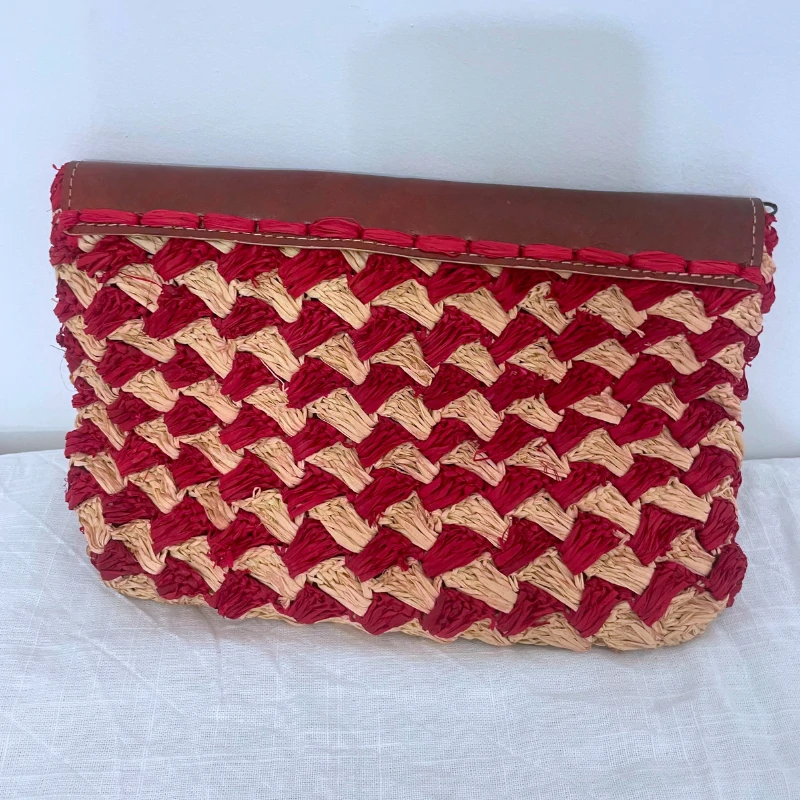 Pochette à main en raphia rouge et cuir naturel 💼✨
