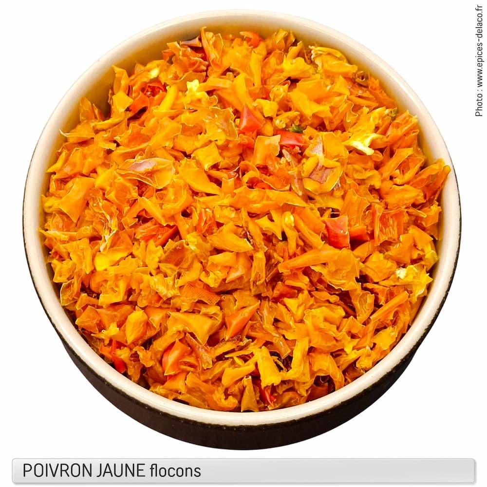 Les poivrons jaunes déshydratés sont des poivrons jaunes qui ont été séchés pour éliminer toute l’eau de leur contenu, ce qui donne une texture plus ferme et une saveur concentrée. Les poivrons jaunes déshydratés peuvent être utilisés dans de nombreuses recettes, notamment les soupes, les sauces, les plats mijotés, les marinades et les assaisonnements. Ils sont également souvent utilisés pour ajouter de la saveur et de la couleur aux plats, en particulier dans les cuisines mexicaine, sud-ouest des États-Unis ou méditerranéenne