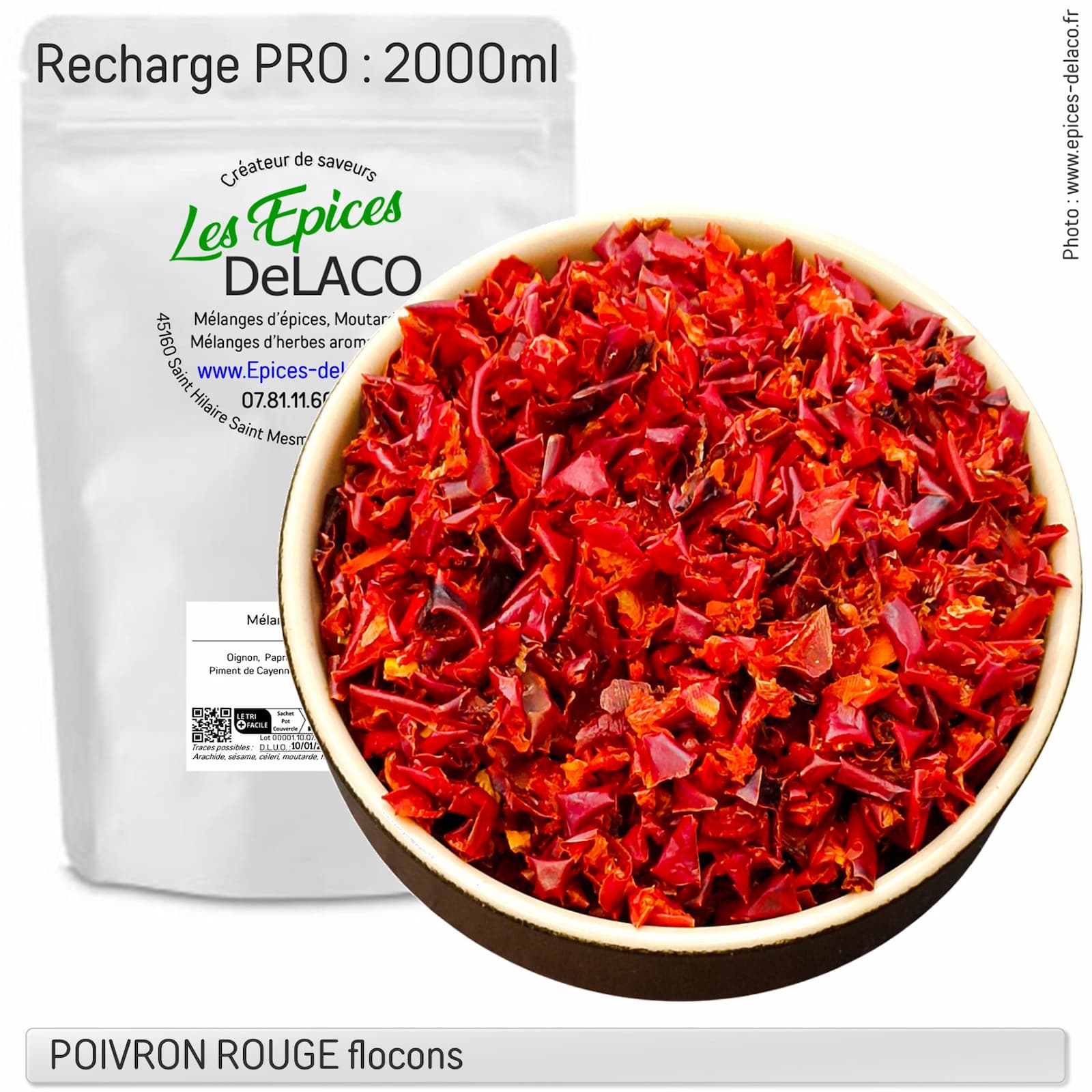 Le poivron rouge flocons sont des poivrons rouges qui ont été séchés pour éliminer l’humidité et prolonger leur durée de conservation. Ils sont souvent utilisés comme condiment ou ingrédient dans divers plats et recettes, tels que les soupes, les sauces, les ragoûts, les marinades, les trempettes, les salades et les garnitures.