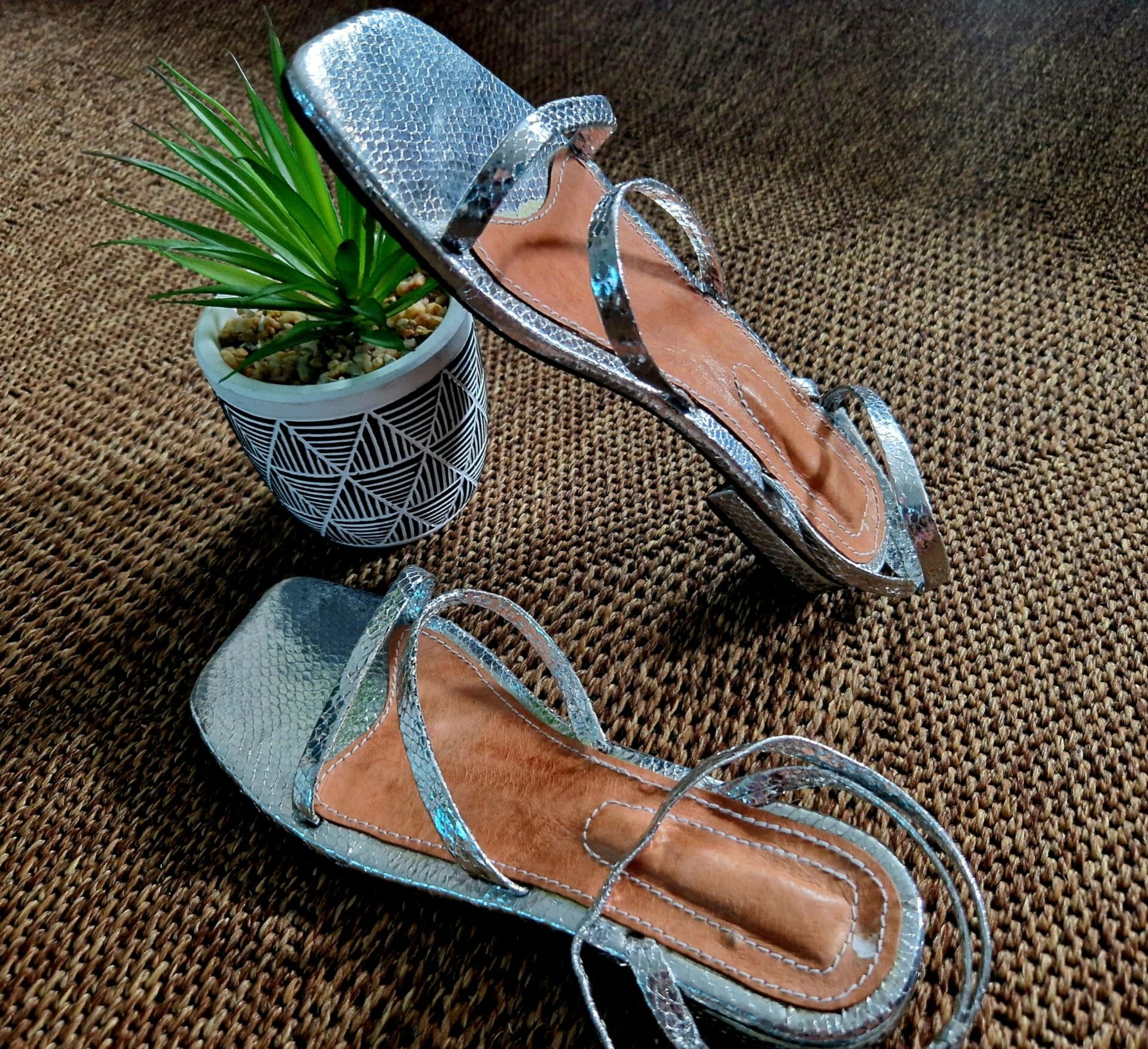 Sandale à talon carré plate argenté artisanale