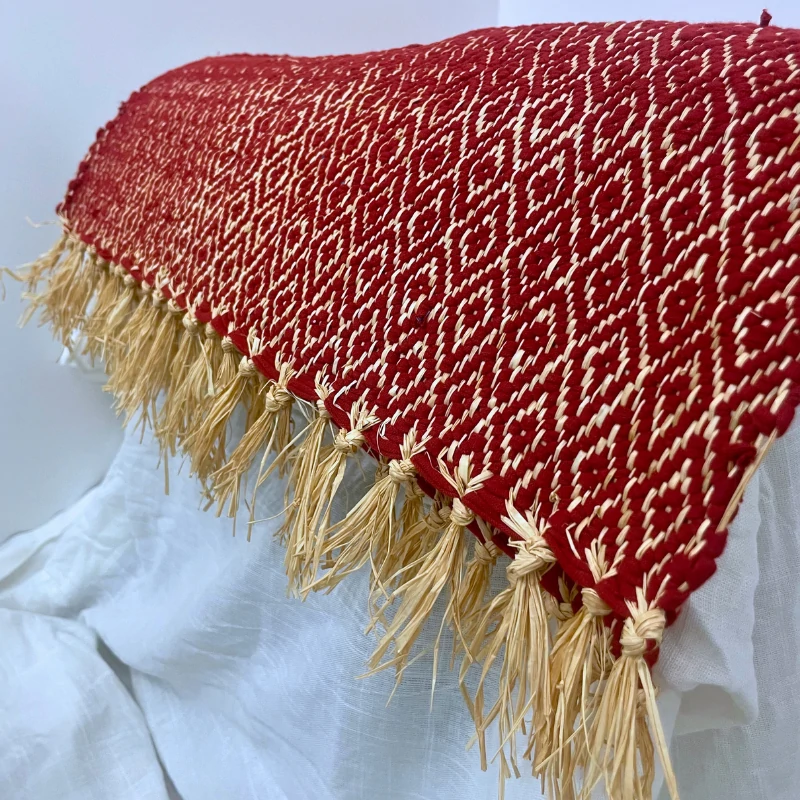 - Design : Sculpté à la main avec des motifs élégants intégrés dans la trame en raphia, complétés par une couleur rouge vibrante qui attire le regard.